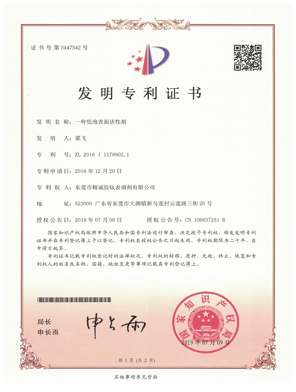 低泡活性劑發明專利證書